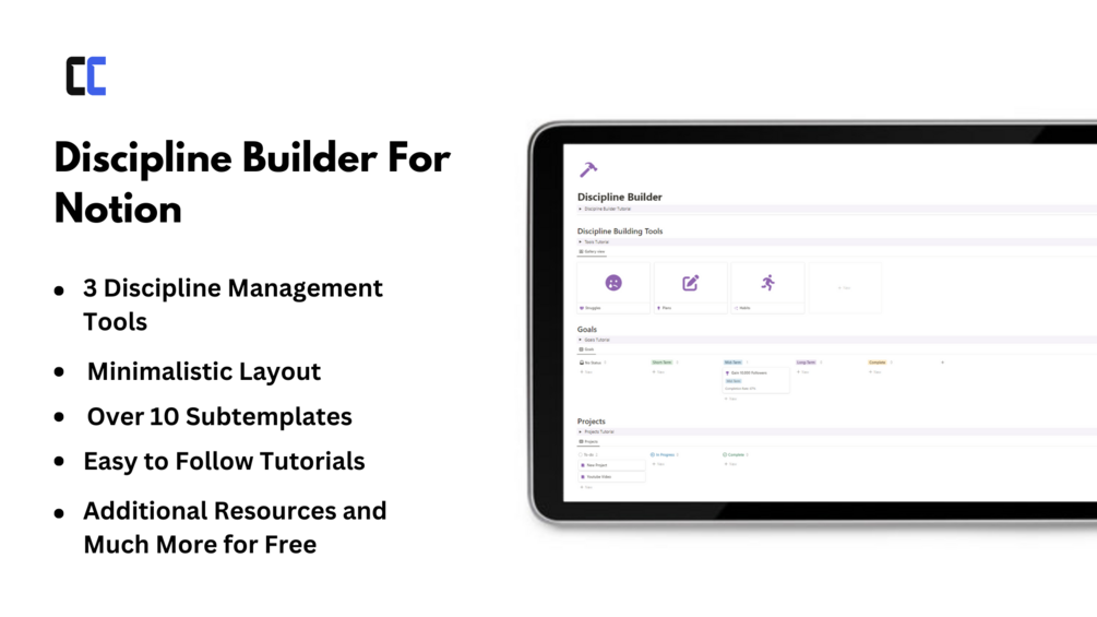 With the Discipline Builder for Notion, you'll never have to look anywhere else for Discipline Building Techniques. This template features a multitude of tools and sub-templates to easily track and improve your discipline including: